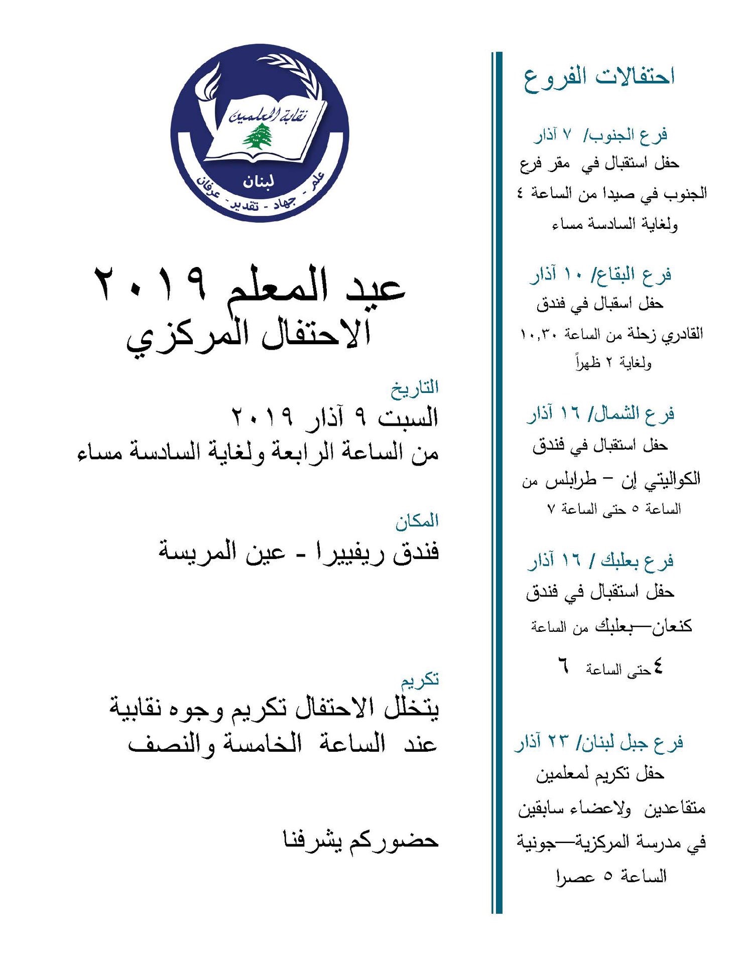 يعقد المجلس التنفيذي لنقابة المعلمين في لبنان مؤتمرا صحافياً غدا الاربعاء الواقع فيه 4/12/2019 يعرض خلاله خطة تحرك النقابة للمرحلة المقبلة على ضوء نتائج الاجتماع في وزارة التربية وانسجاماً مع مطالب المعلمين وتحركاتهم الاحتجاجية رفضا للمس برواتبهم .